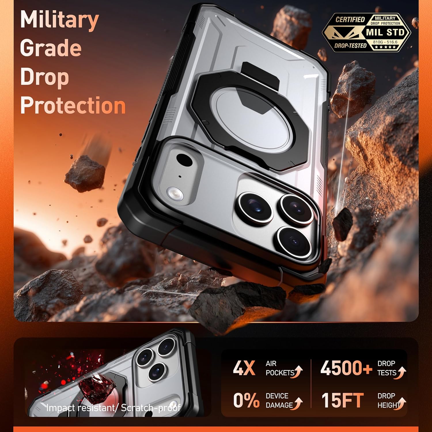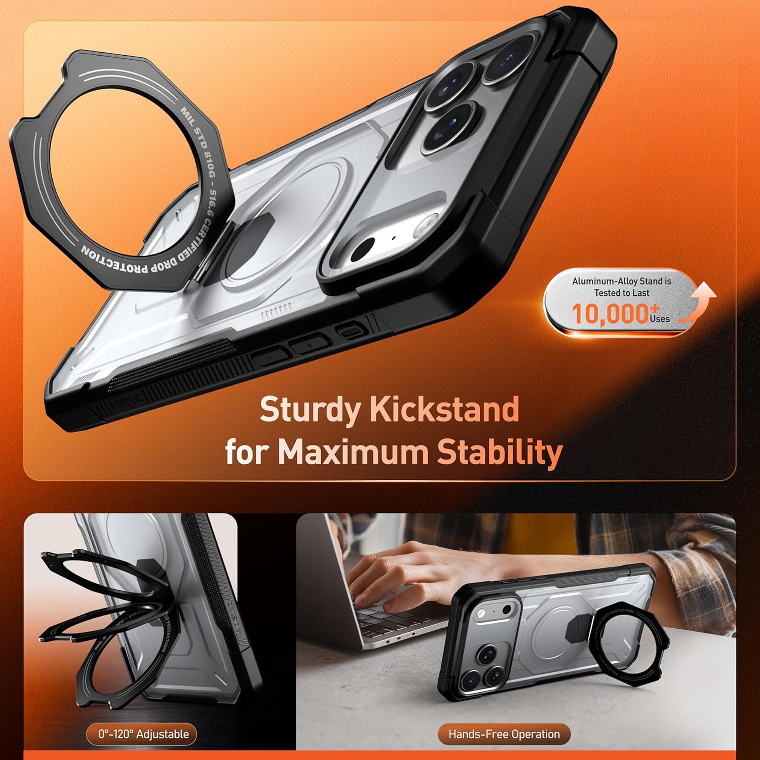 - [MagSafe Ring Stand] - The iPhone 17 Pro Case includes a hidden magnetic Aluminum Alloy Ring stand with the strongest N52 magnet array, boasting a 15N ultra-strong magnetic force up to 1350g. It is compatible with MagSafe wireless chargers, magnetic car mounts, magnetic wireless chargers, and wireless chargers.