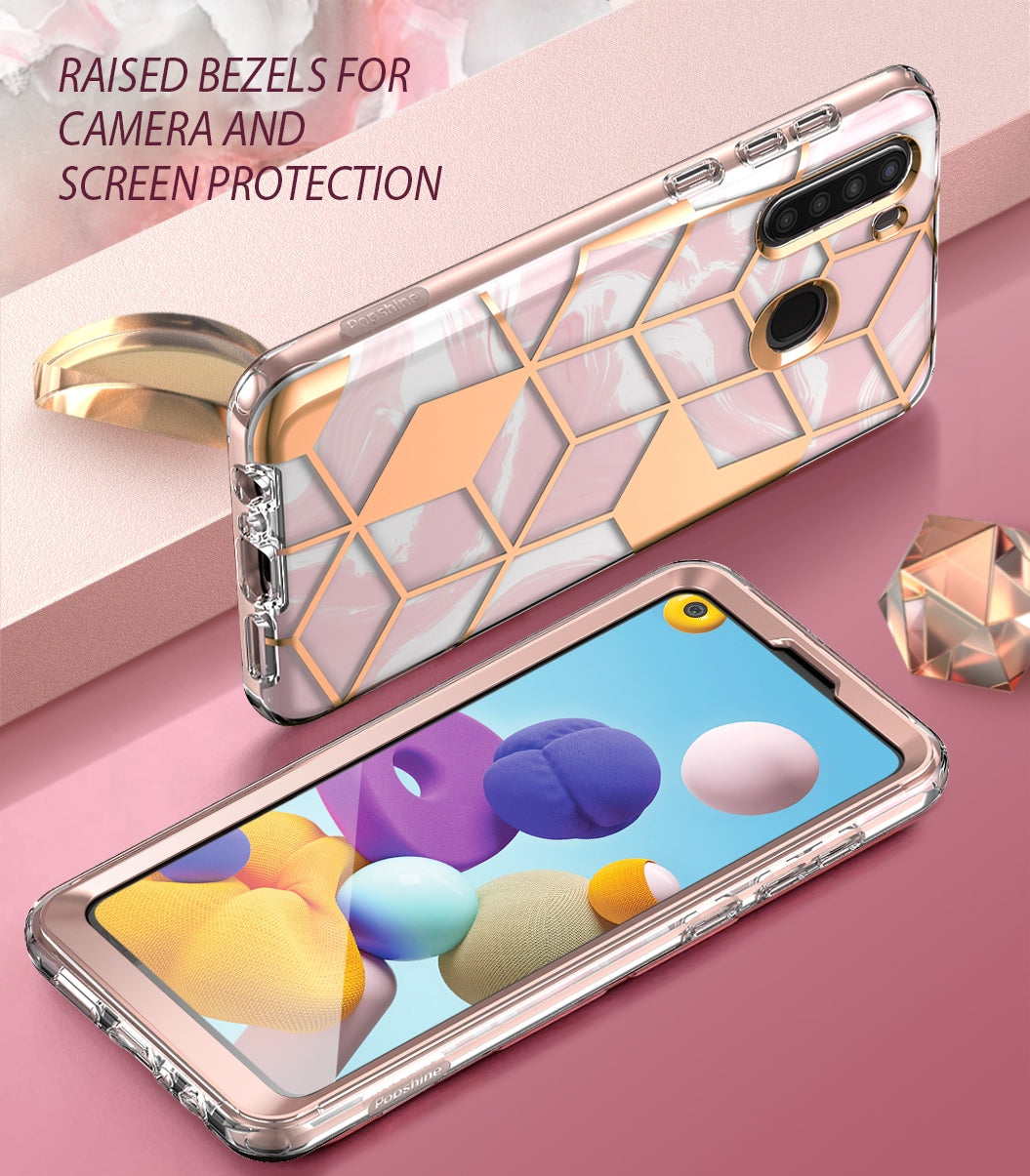 - STYLISH AND PROTECTIVE - Shock absorbent TPU lining wraps your phone safely and securely. Trendy Liquid Marble with golden or silver design lining scratch-resistant back protects your phone from scratch and fade, Touch-sensitive screen protector completes this 360-degree protection for your Samsung Galaxy A21.