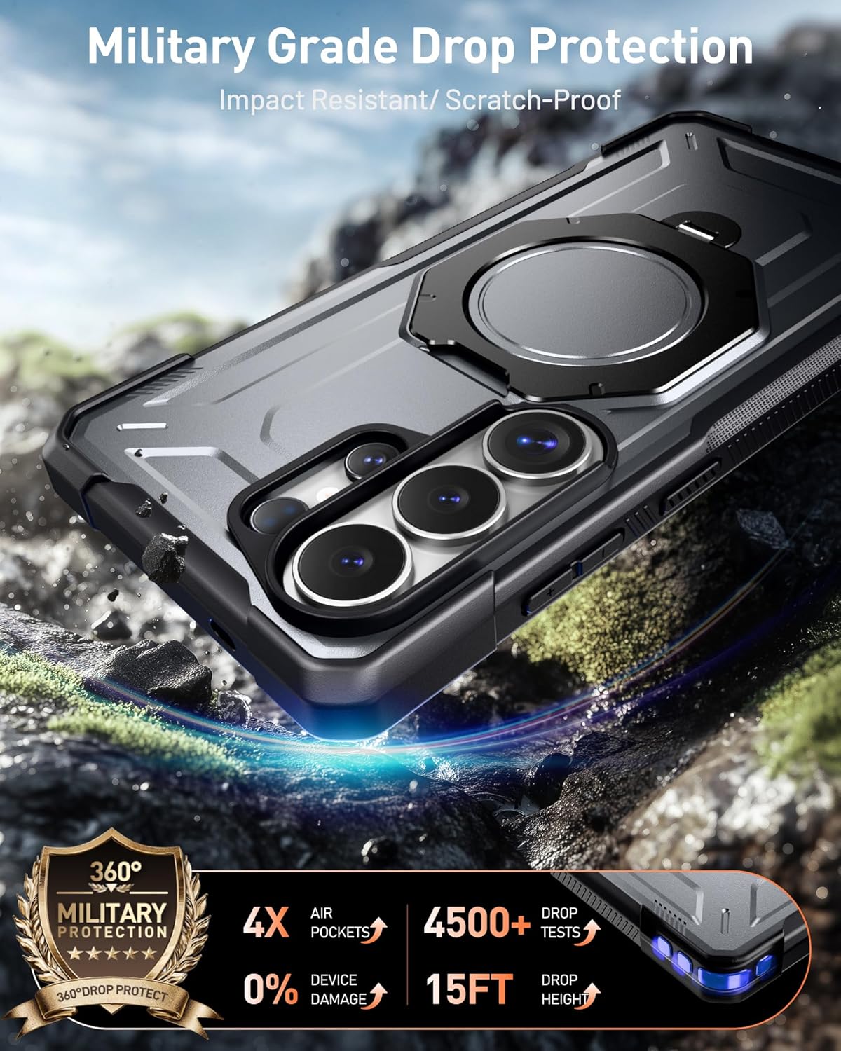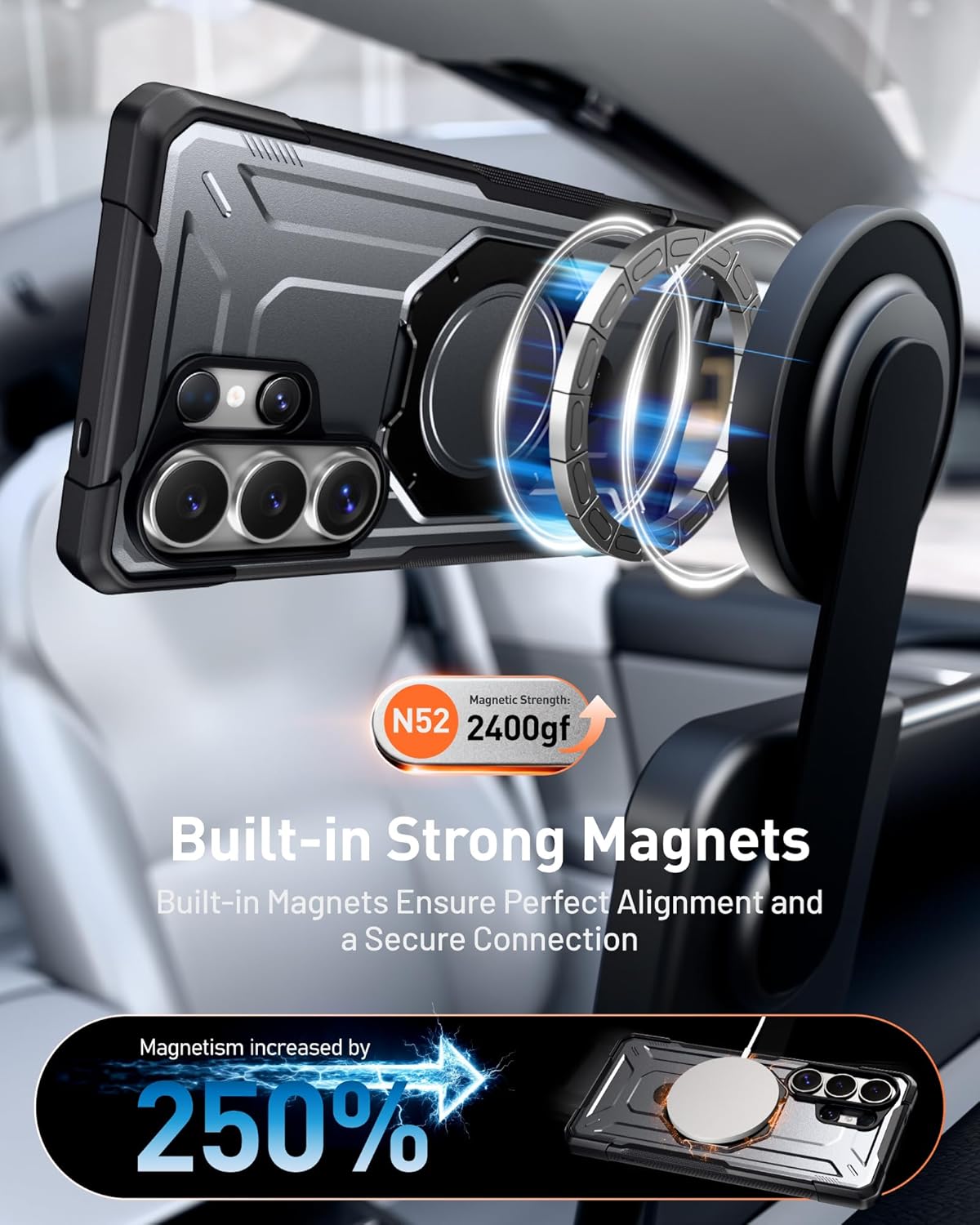 - 360° Spin Magnetic Ring Stand: This S26 Ultra Case includes a hidden magnetic Aluminum Alloy Ring stand with the strongest N52 magnet array, boasting a 15N ultra-strong magnetic force up to 1350g. Powerful magnetic attraction compatible with MagSafe and Qi2 wireless chargers. It securely connects to magnetic accessories like car mounts for a stable connection during rotation or movement. This kickstand with vertical and horizontal viewing angles free your hands to do other things