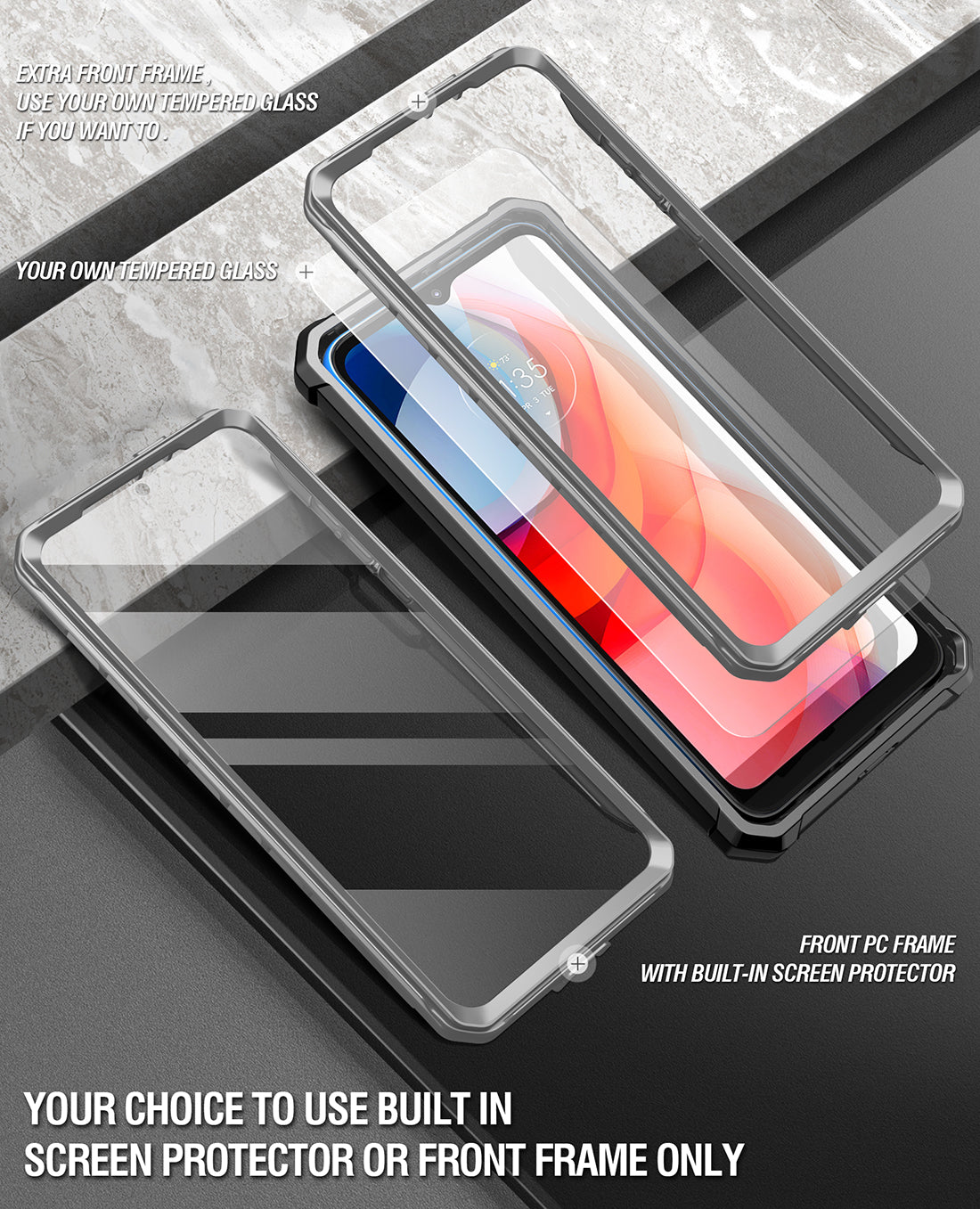 - EXTRA Front Frame - For people who don't like to use built in screen protectors, Poetic has included an extra front frame to use with your own tempered glass. <