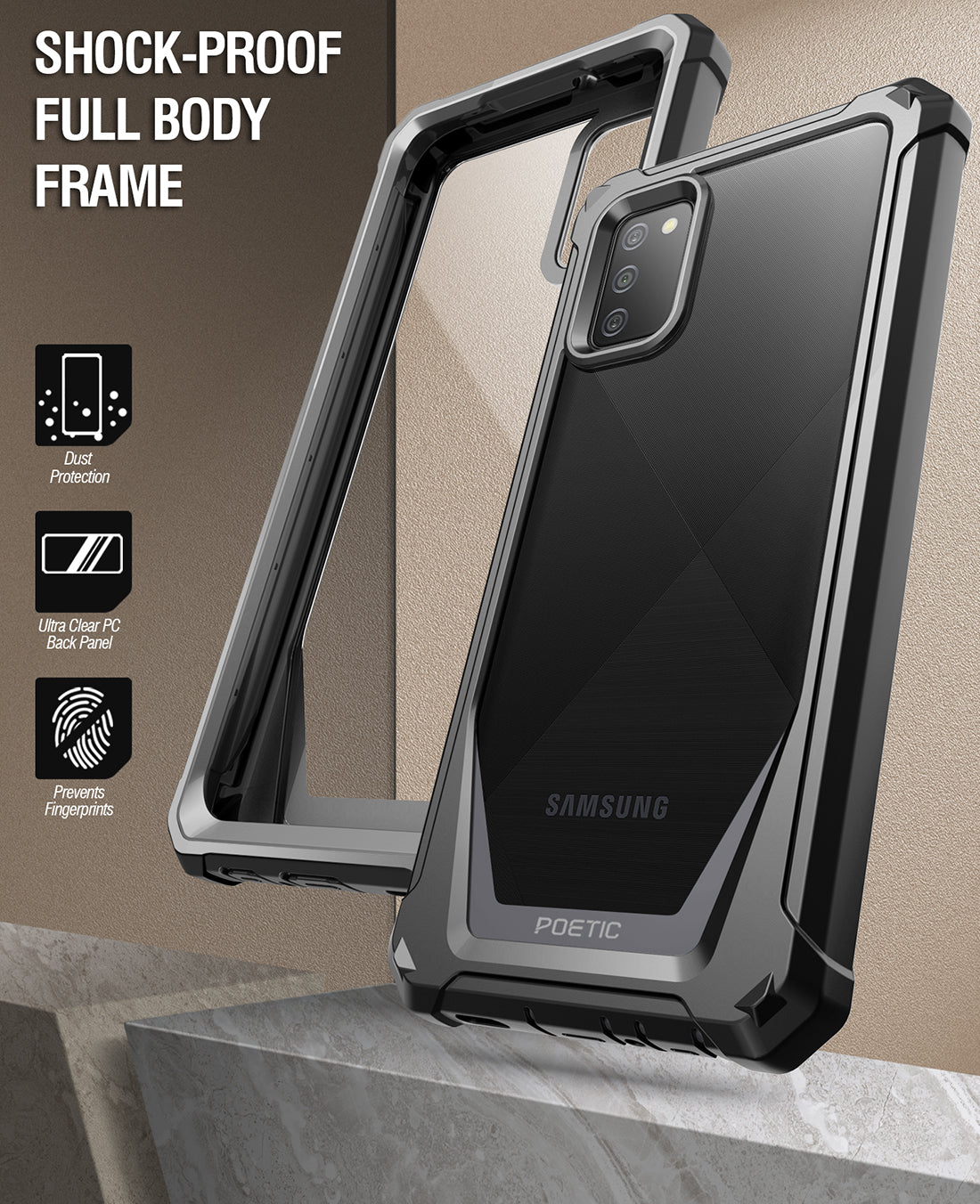 - Military Grade Drop Tested Protects your Samsung Galaxy A02S from all angles. Includes: Built-in Screen Protector, Clear polycarbonate back, and TPU lining and Bumpers.